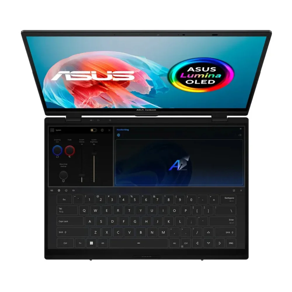 El ASUS Zenbook Duo OLED un revolucionado portátil con dos pantallas táctiles OLED de 14″ pulgadas cada una, equipada con un teclado desmontable magnético Bluetooth de tamaño completo, y un soporte integrado. Combinando expertamente versatilidad multitarea con una movilidad excepcional, las dos pantallas expanden instantáneamente el espacio de trabajo a hasta 19.8″. El rendimiento excepcional está garantizado con el procesador Intel Core Ultra impulsado por Inteligencia Artificial (IA ) , combinado con software inteligente dedicado, control de gestos intuitivo y una batería de mayor capacidad.